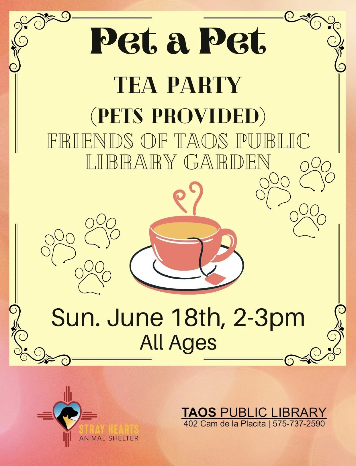 June 18 - PET A PET Tea Party. Taos Public Library 2-3PM. All Ages Welcome.